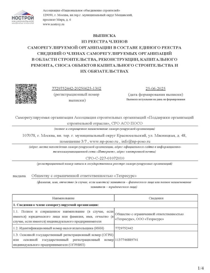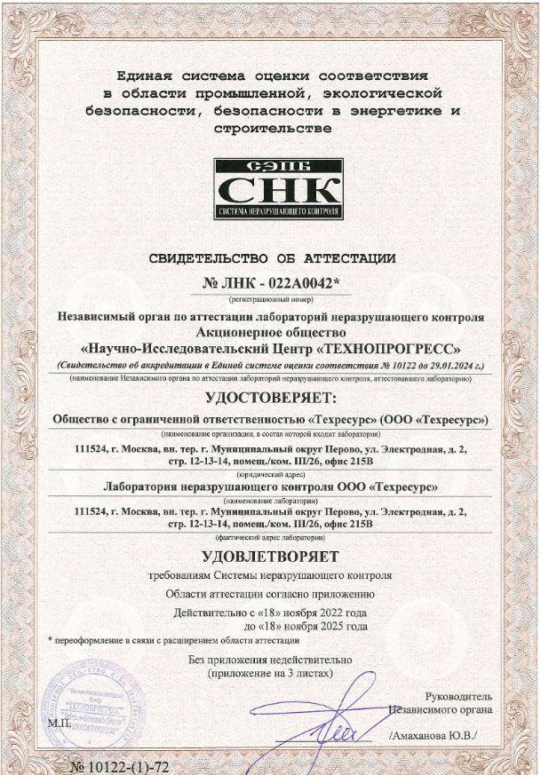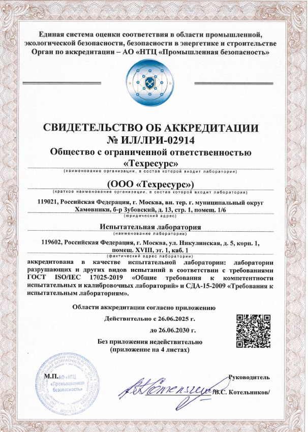 ООО «Техресурс» обладает полным комплектом разрешительной документации. Предприятие является членом Саморегулируемых организаций (СРО) по проектированию, строительству, имеет лицензию на осуществление деятельности по проведению экспертизы промышленной безопасности, имеет в собственности аккредитованную лабораторию неразрушающего контроля, строительную и электротехническую лабораторию.